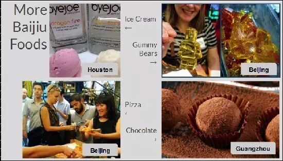 此外,还有一些酒吧和餐厅会推出一些在国外自酿自销的白酒洋品牌供客人品尝,包括新西兰的太紫(Taizi)、加拿大的龙雾(Dragon’s Mist)、美国和波兰的Vinn。还有一些从中国采购白酒原酒,再用另一品牌来销售的国外白酒品牌,比如美国的Byejoe和Confucius Wisdom(智酒)等,这些在当地都很受欢迎。也有一些酒吧和餐厅把白酒洒在比萨、冰淇淋和巧克力等食物上制作出许多独特的食物,比如用白酒的酒曲来发酵的啤酒,以及用白酒洒在海绵型蛋糕上,然后把蛋糕放进油锅里油炸的油炸白酒蛋糕等等。